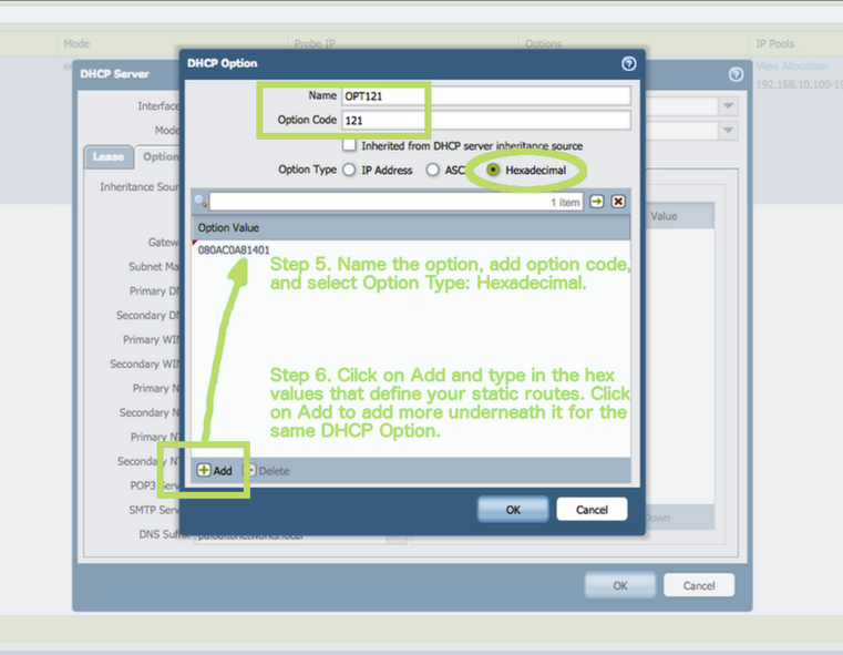 3. In the DHCP Option selection, give the Option a name. Enter the option code (33, 121, or 249) and select Option Type: Hexadecimal. Then select Add to enter your static routes in their hexadecimal notation.