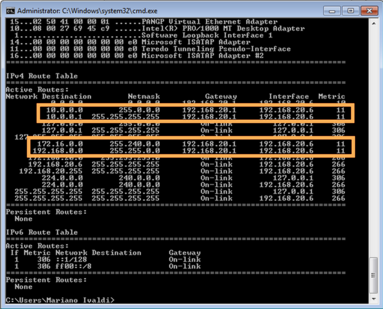 Here is the resulting output of “route PRINT” command in Windows 7: