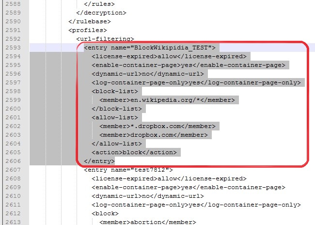 Locate the section of code that needs to be transferred and copy it. For example, to copy a URL filtering object named "BlockWikipidia_TEST", copy the content starting from <entry name="BlockWikipidia_TEST"> to </entry>.