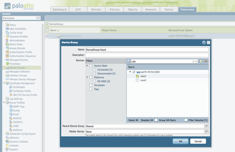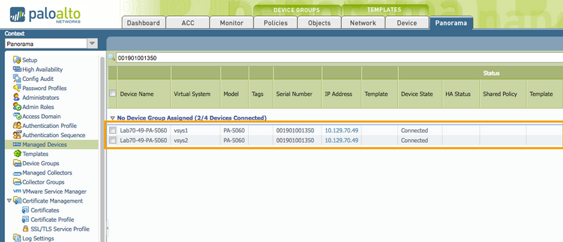 在这种情况下, 必须将目标 Vsys 绑定到唯一的设备组。如果来自防火墙的多个 Vsys 是同一设备组的一部分, 则无法控制全景管理员的每个 Vsys 管理。
