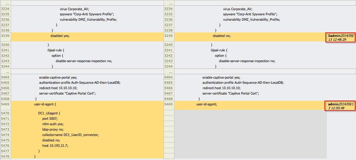 One can also compare different versions of the configuration instead of selecting "running configuration" and "candidate configuration". This comparison just displays who committed the configuration and not individual changes done by each administrator.