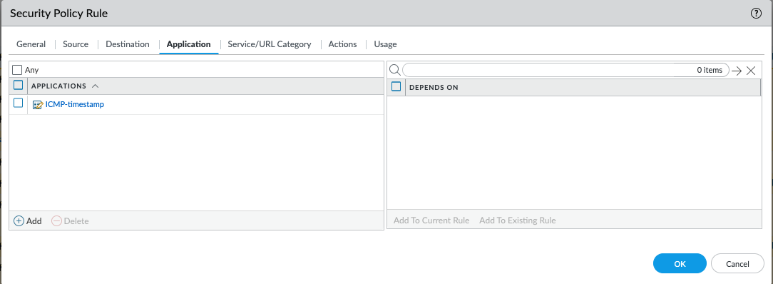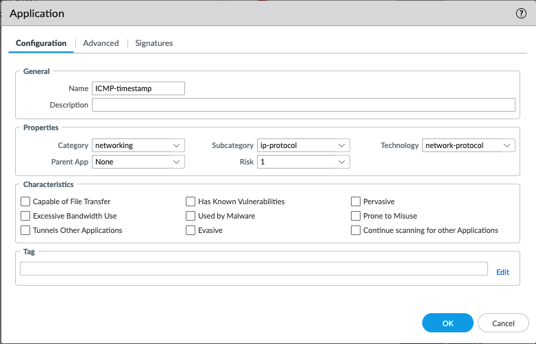 - Go to Objects > Applications > Add and create a custom name (for this scenario, Block Type 13, ICMP-timestamp ) and specify a category: