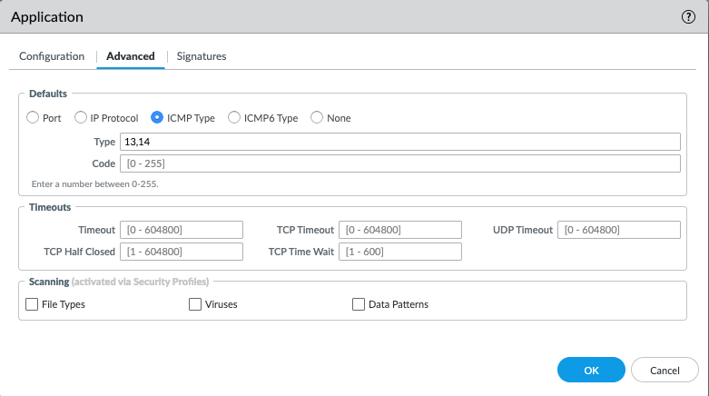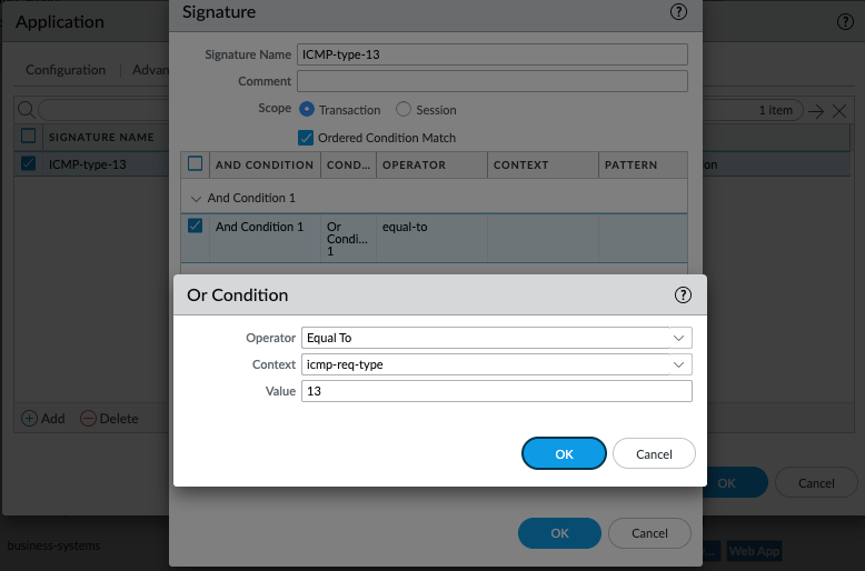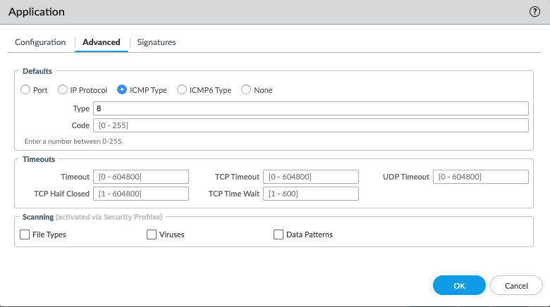 For example, to allow only ICMP echo requests but deny the rest of ICMP traffic, create a custom app for the ICMP traffic based on the ICMP packet type (8). For this kind of custom application, it is not necessary to create an application override policy as in the case of TCP/UDP traffic.