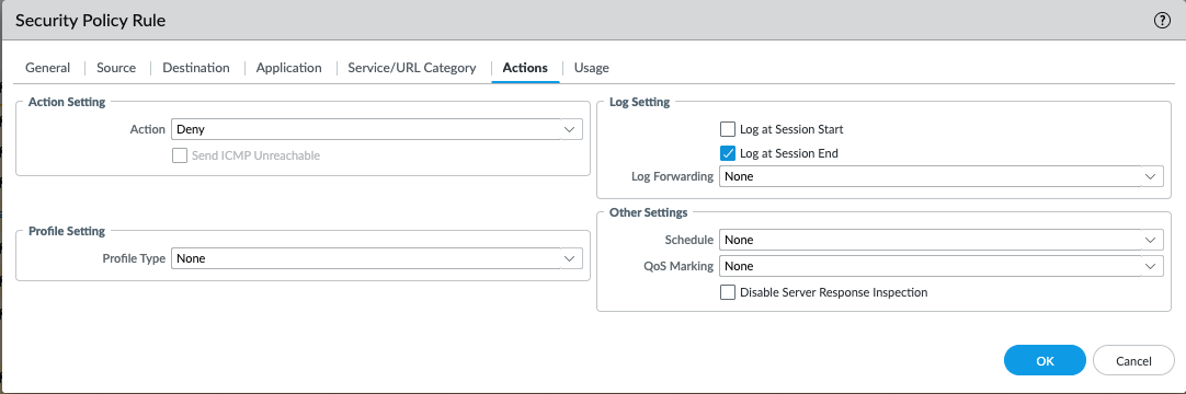 - Save the application and add it to a deny policy (shown in example), placed on the top of Policies from any-to-any zone, so all the traffic denies this application: