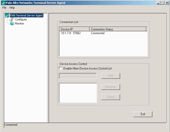 The main panel will show the Connection List which displays each PAN device connected to the TS agent as well as the device access control list. By default Device Access Control list is disabled. Enable this option if you want to specify which PAN device the TS Agent will listen to. The TS agent will ONLY accept incoming connections from the devices in the allow list.
