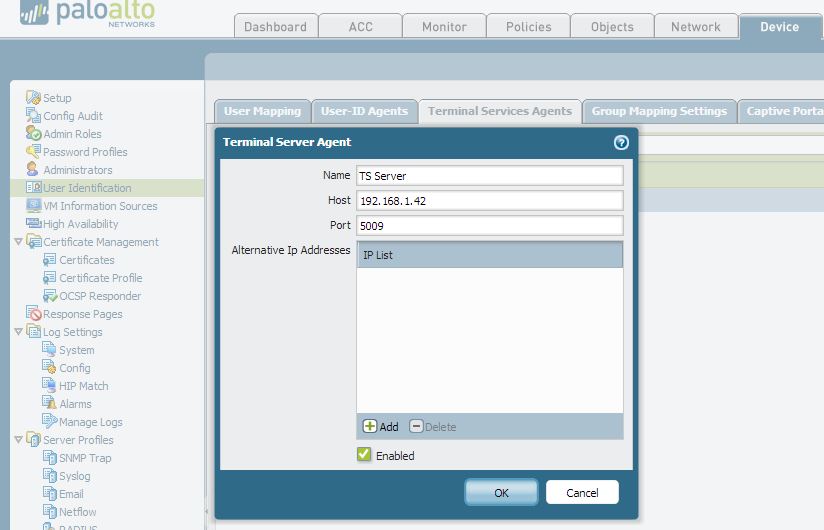 The User-ID Agent's “enable-user-identification” and “User Identification ACL” configuration command also apply to TS Agent. This means that if the user-identification feature is enabled, both User-ID Agent and TS Agent features will be enabled.