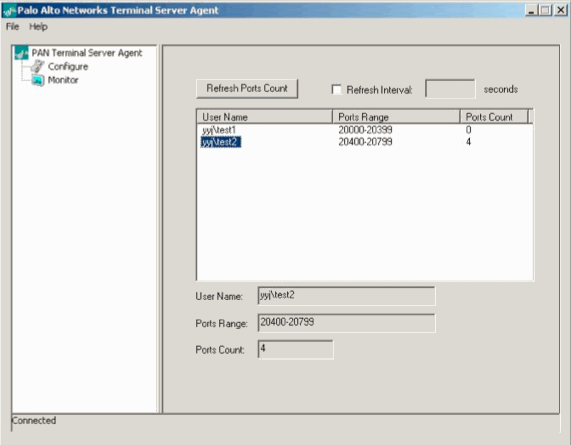 The monitor operation from the navigation window displays all of the current users and port allocations. The “Ports Count” shows the currently used ports for the user. The Ports Count can be refreshed by clicking the “Refresh Ports Count”. You can also manually set a refresh interval by selecting the checkbox “Refresh Interval”.