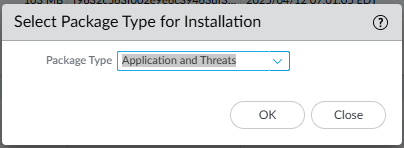 - Select Package Type for the upload: Application and Threats, Antivirus, or WildFire. Browse and select the appropriate file and click OK