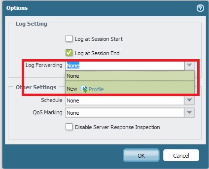 - The new log forwarding profile is now attached to the policy. Click OK.