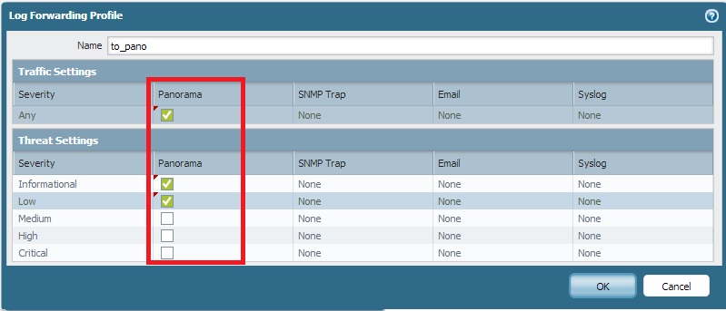 In order to see entries in the Panorama Monitor > Traffic or Monitor > Log screens, a profile must be created on the Palo Alto Networks device (or pushed from Panorama) to forward log traffic to Panorama. This document describes how to create the profile locally on the Palo Alto Networks device: