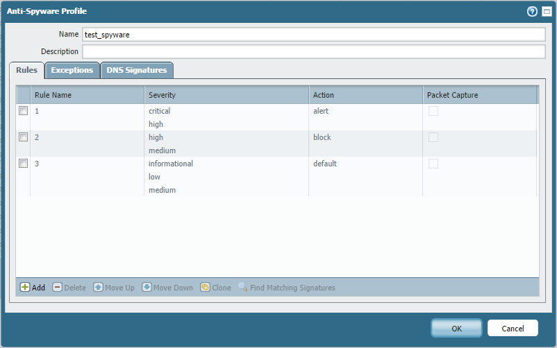次のスパイウェアプロファイルには3つのルールがあります。