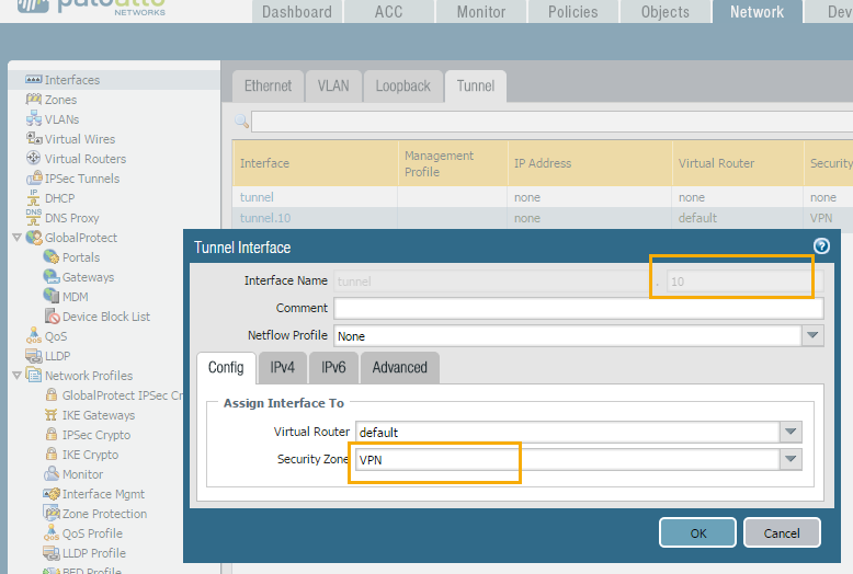 4. Create a tunnel interface under Network > Interfaces >Tunnel. Give a tunnel number, virtual router and security zone. It is recommended to create a separate zone for VPN traffic as it gives better flexibility to create separate security rules for the VPN traffic.