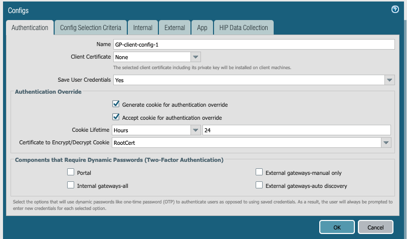 -(Optional) Authentication override: Check the boxes for 'Generate cookie for authentication override' and 'Accept cookie for authentication override'. This cookie can be encrypted/decrypted using any certificate selected from the drop down of 'Certificate to Encrypt/Decrypt Cookie'. Note: If a certificate is selected here under portal, the same needs to be selected here under Gateway 'certificate to encrypt/decrypt cookie'.