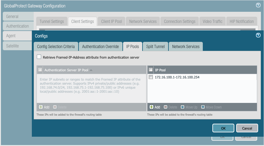 • The GlobalProtect gateway will be assigning IPs from this pool to clients. Specify the one or more IP pool ranges which DO NOT OVERLAP with any of the existing networks in the organization. Overlapping subnets can cause routing issues and network outages.