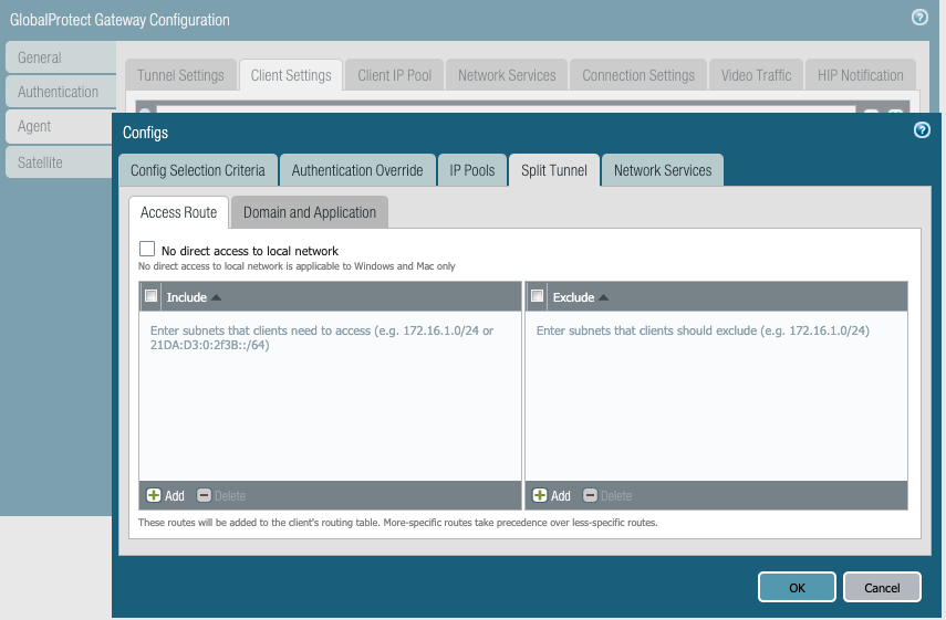 • For split tunneling: Specify required internal subnets like 10.0.0.0/8, 192.168.x.0/24 etc so that GP client will use the tunnel to reach only these subnets. Anything outside these subnets will be accessed directly from the client's local network, this is called split tunneling.