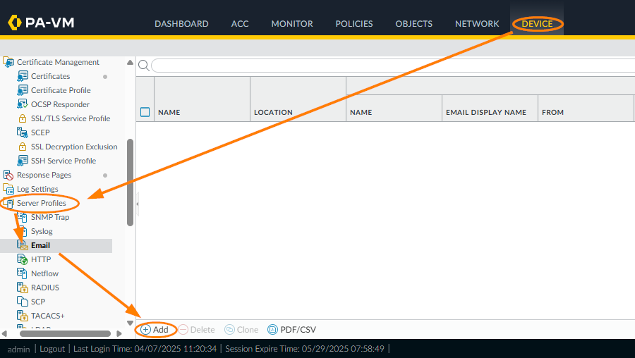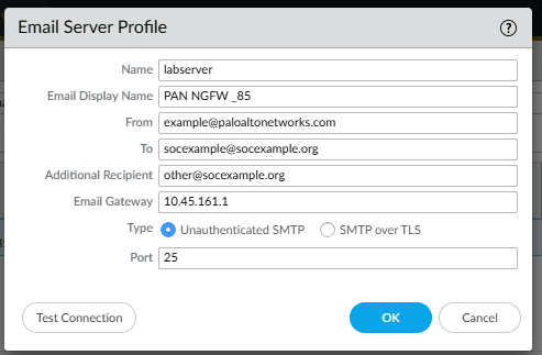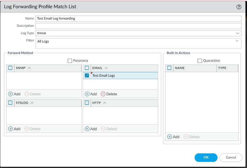 - Fill in which logs you want forward (below we select threat logs) and add the email profile we created previously as shown in the below example: