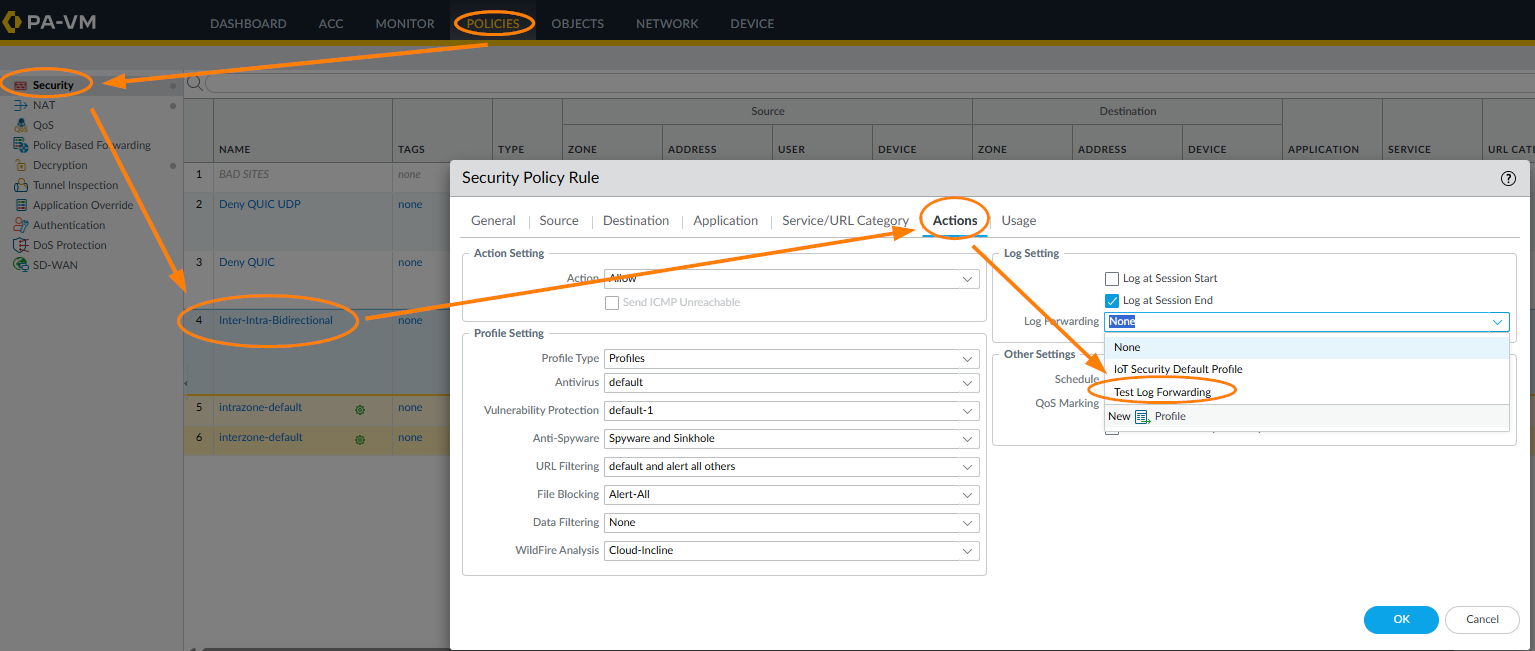 - As we are forwarding threat log, make sure you have security profiles also configured to the policy rule as shown.
