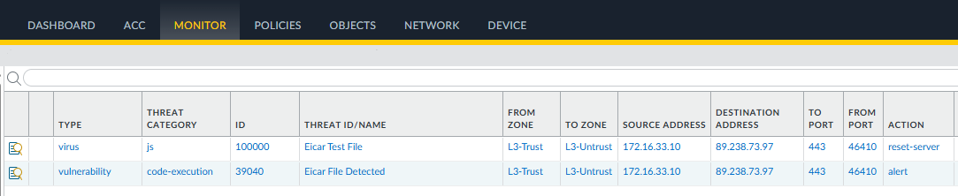 - To test the policy, use a workstation to download a test virus, for example, go to eicar.org and download a test file.