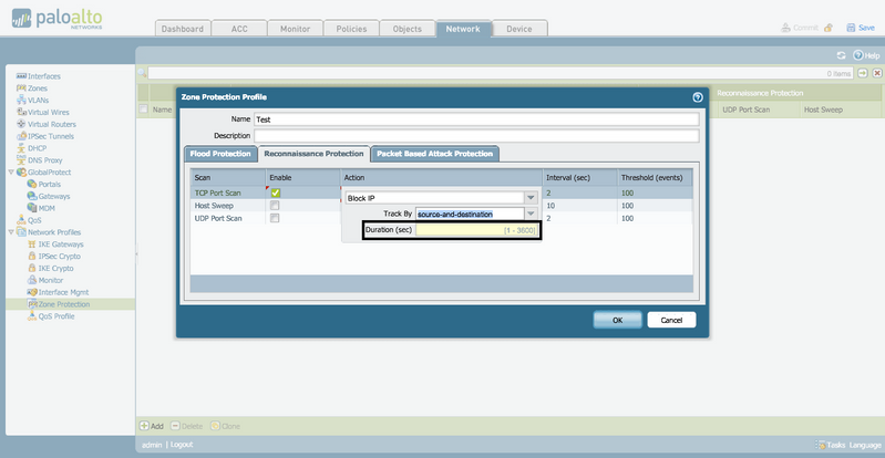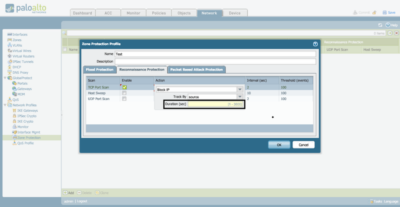 - Inside of the WebGUI Go To: Network > Network Profiles > Zone Protection > Zone Protection Profile > Reconnaissance Protection.
