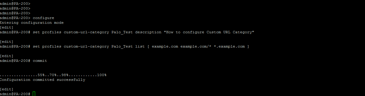 > configure # set profiles custom-url-category Palo_Test description "How to configure Custom URL Category" # set profiles custom-url-category Palo_Test list [ example.com example.com/* *.example.com ] # commit