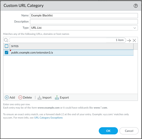 1. Go to Objects > Custom Objects > URL Category, add a custom URL category named "Example Blacklist". Add public.example.com/extension1/a as an URL, do not prepend https:// to the URL list.