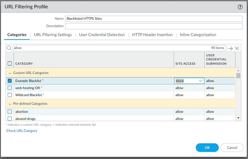 3. Go to Objects > Security Profiles > URL Filtering, create an URL Filtering profile named "Blacklisted HTTPS Sites" with "Example Blacklist" Custom URL Category with action *block*