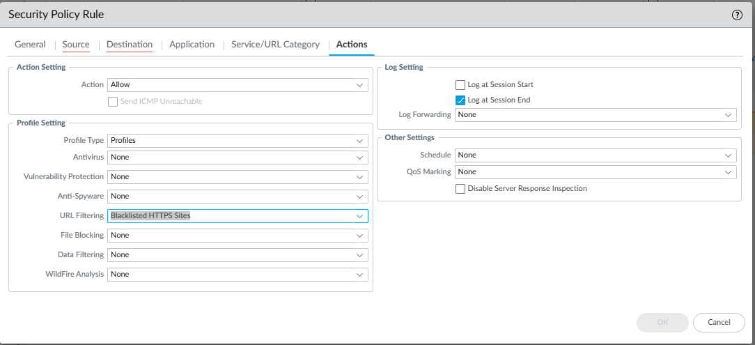 4. Go to Policies > Security, add a security policy for trust to untrust traffic named "Deny HTTPS Sites", leave the action to allow, select Profile Settings > Profile Type and select Profiles. Select URL Filtering "Blacklisted HTTPS Sites".