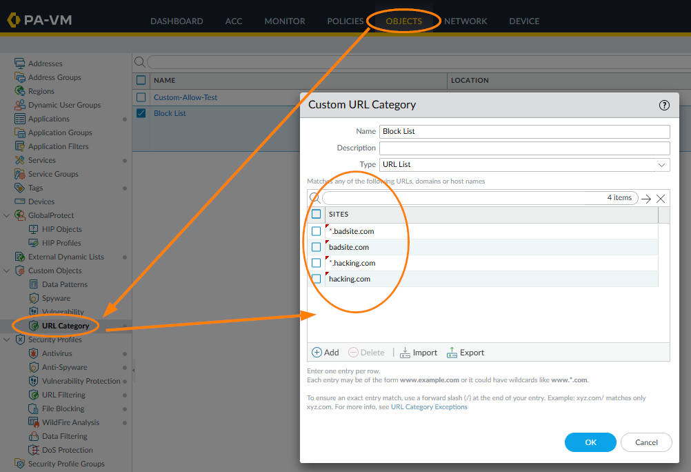 Create a Custom URL Category by going to Objects > Custom Objects > URL Category. Click 'Add' on the bottom-left part of the screen, give it a Name and Description(optional), then 'Add' the URL's as needed. Note: Please remember there is a difference between site.com and *.site.com