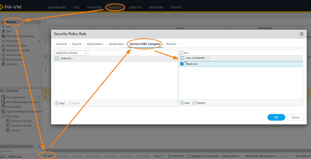 Add the Custom URL Category into a rule by using the "URL Category" section located in Service/URL Category tab when creating a new rule: By blocking sites with the URL Category, this still allows other URL Filtering Profiles to be applied to later rules.