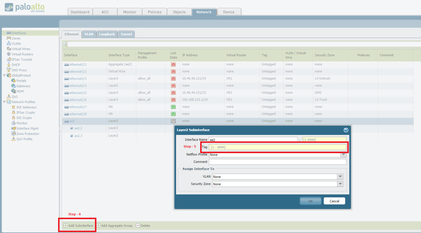 Go to Network > Interfaces > Ethernet and click Add Subinterface. - CLI: