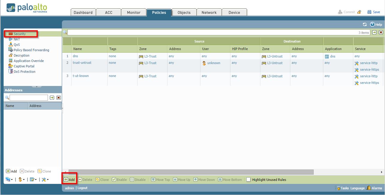 From the Web UI, go to Policies > Security and click the Add icon in the lower left: