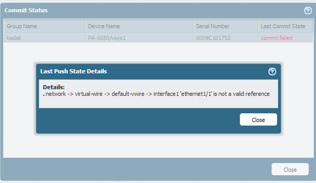警告:ファイアウォールの既定の vwire 構成が、パノラマプッシュの前に削除されていない場合 (上記の手順 1)、コミットは次のエラーで失敗します。