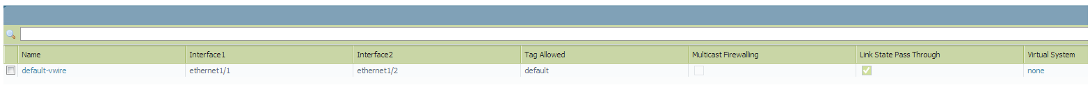 このドキュメントでは、強制パノラマテンプレートを使用して、パロアルトネットワークファイアウォールの既定の構成を削除する方法について説明します。パロアルトネットワークファイアウォールは、ethernet1/1 および ethernet1/2 インターフェイスを使用して、デフォルトの仮想ワイヤ (vwire) 構成で事前設定されています。次の例は、既定の vwire 構成を示しています。