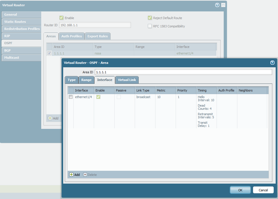 - Configure el área que se NSSA y la interfaz que pertenece al NSSA. En el router virtual > OSPF > áreas