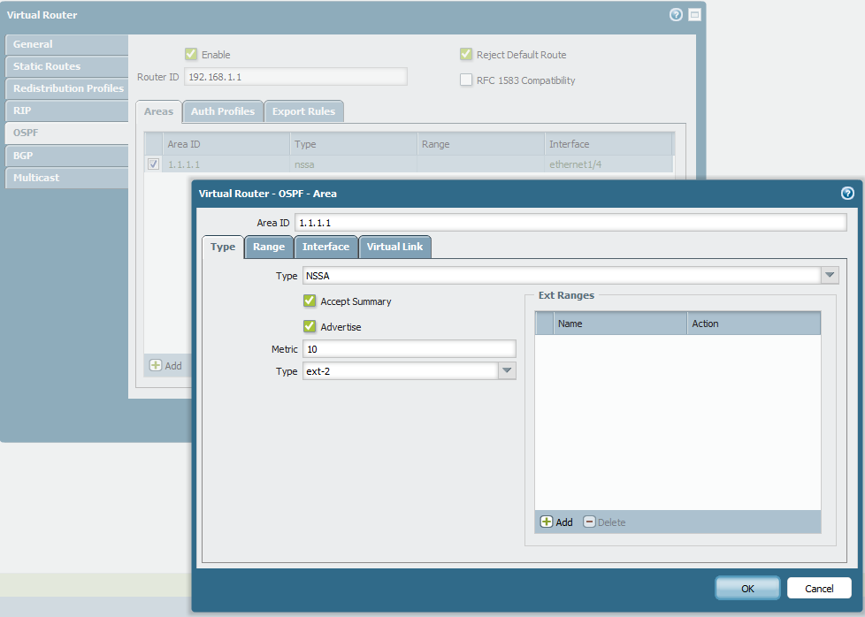 - NSSA する領域と、NSSA に属するインターフェイスを構成します。[仮想ルーター] > [OSPF] > [領域]