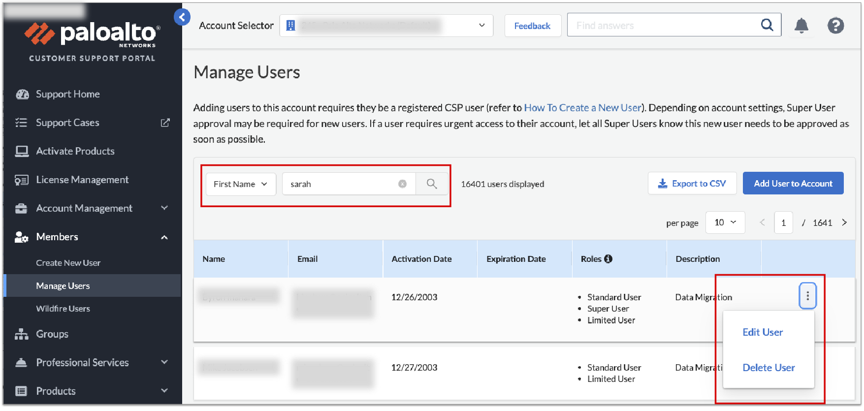 When a new user is added to an account, it can take several minutes to synchronize the new user's account to all Palo Alto Networks systems. For example, if the new user cannot open a support case immediately after the user's account is created, ask the user to wait several minutes. The user will then be able to open the support case. |