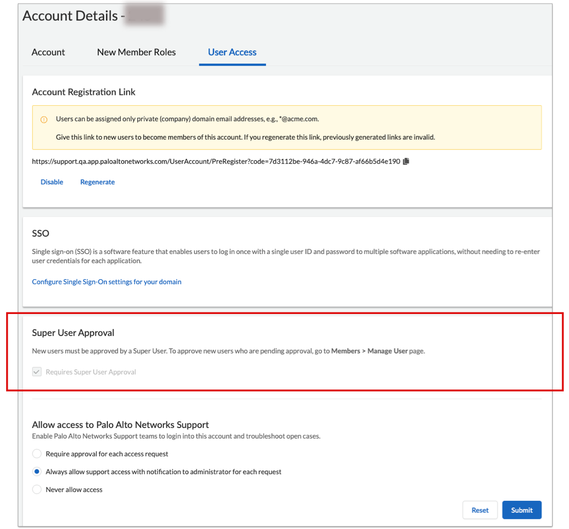 Support Portal accounts require Super User approval when adding new members to an account. See Account Management > Account Details, tab User Access, section Super User Approval. Note the Requires Super User Approval flag is enabled and read-only.