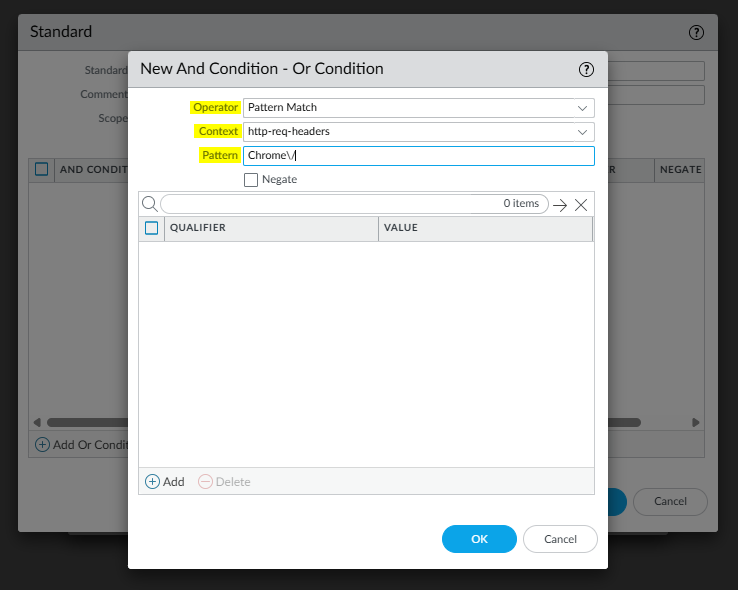 In this example, we'll look for the pattern match 'Chrome/' in the Context field 'http-req-headers' as shown in the example below: