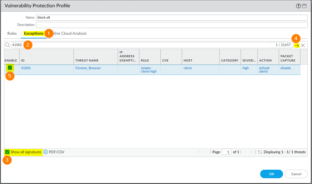 Click the Exceptions tab and search for the custom threat ID (41001). Make sure to check the Show all signatures box to list the searched TID