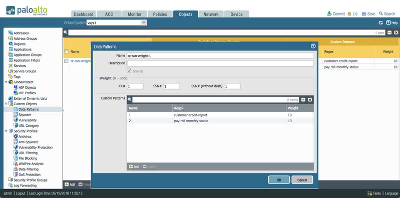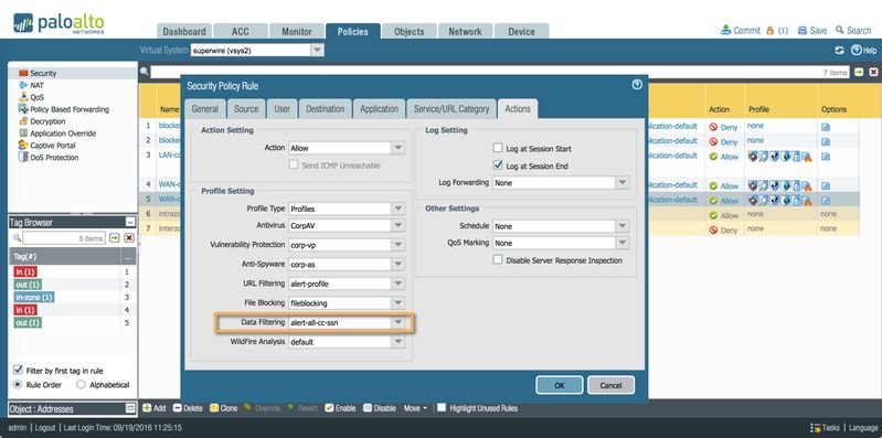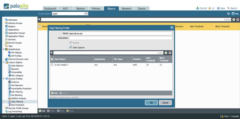 - このプロファイルをセキュリティルールに追加します。 このルールは、上記の条件でデータパターンとアラートを探します。これにより、一部の誤検出が防止されます。