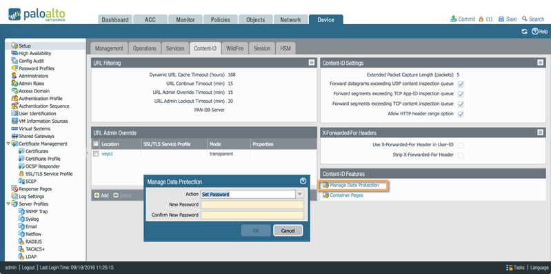 packetcaptures に含まれるデータを保護するために、Dta 保護を有効にして、すべての packetcaptures を保護するパスワードを設定できます。 パスワードは、デバイス >のセットアップ >コンテンツ - ID >データ保護の管理から設定できます。