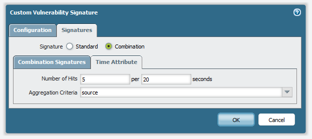 Enter custom signatures: let's configure this so we can block any source IP address that attempts more than 5 logons within 20 seconds—an arbitrary chosen value with little experience—adjust according to your needs and experience. My approach would be to tighten those values to whatever will not obstruct too many regular users from accessing the website on a daily basis.