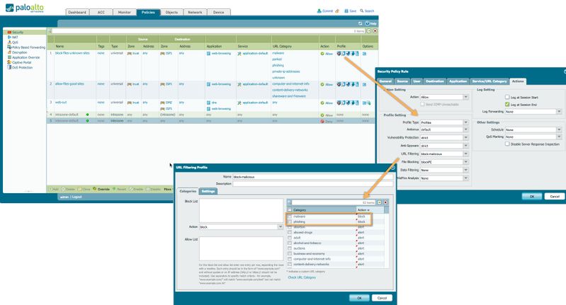 Below you can see an example security policy where rule #1 is intended to block filetypes from certain categories, rule #2 will allow downloads from certain categories and rule #3 will be the catchall for all other outbound sessions