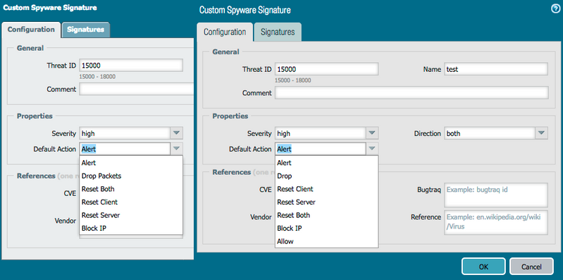 2016-11-29_13-40-11.pngAdded Actions from PAN-OS 7.0 OnwardsNote that for Custom Vulnerability signatures, we already had the Reset Both, Reset Client, Reset Server options.  We added an Allow action from PAN-OS 7.0 onwards.  Below screenshots illustrate the change from pre PAN-OS 7.0 to PAN-OS 7.0 onwards.