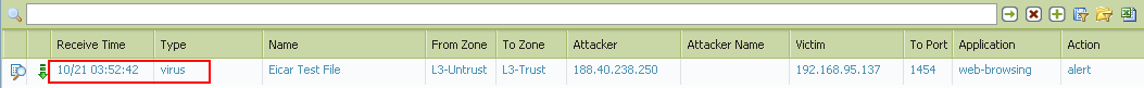 - Los perfiles de amenazas seguirán aplicándose, utilizando las versiones de antivirus y aplicaciones y amenazas que se instalaron cuando expiró la licencia. Por ejemplo, al descargar un archivo de prueba EICAR, los perfiles de amenazas se siguen aplicando: