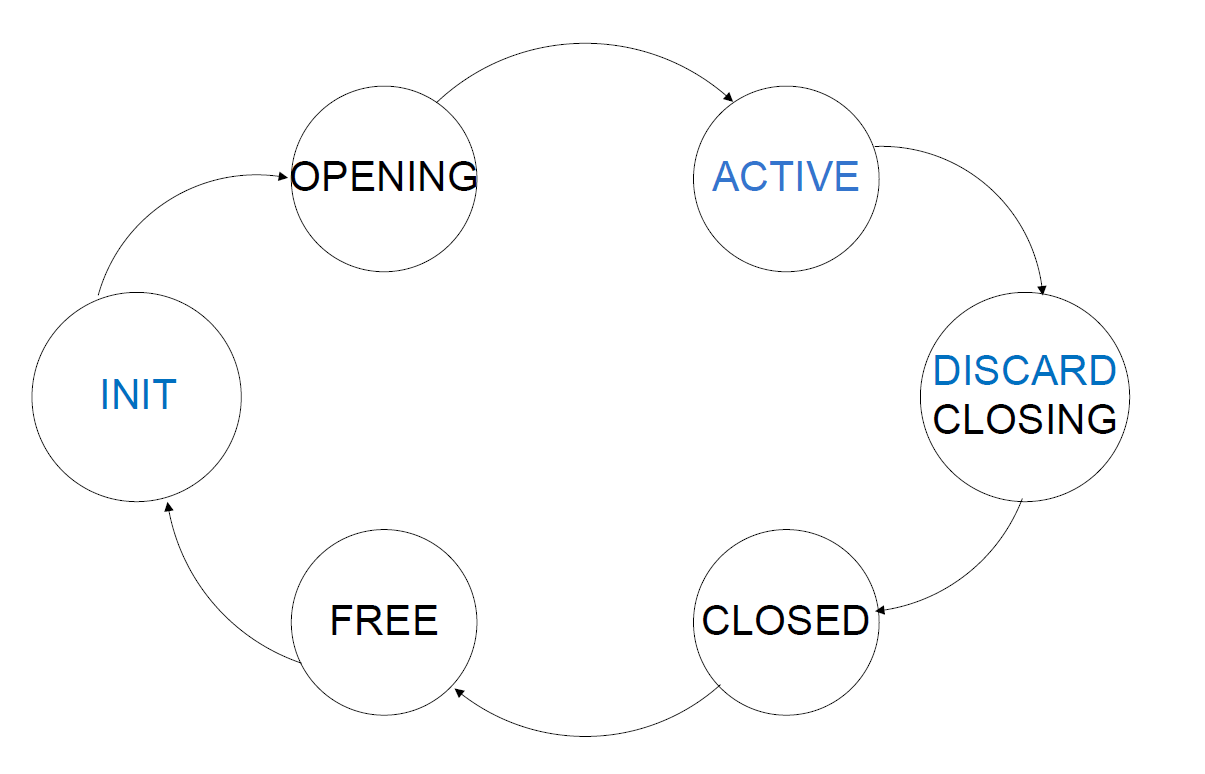 Under normal conditions, each state will go through the following transition cycle: Init > Opening > Active > Discard/Closing > Closed > Free. From the Free state, the session will move back to the initial session state(INIT) to start the next cycle. The following state transition represents the session life cycle: