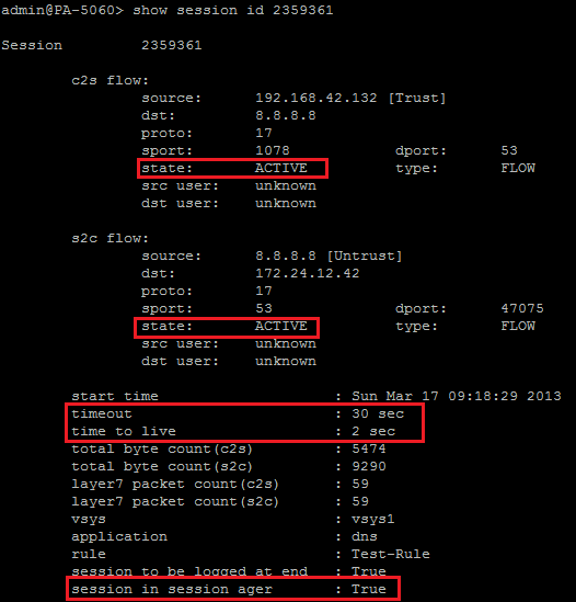 Each session has a defined timeout value which is configurable on the device. There are a few details that can be observed regarding the timer of a session by looking at the output of the > show session id command. The screenshot below shows the output of a DNS session through the firewall: