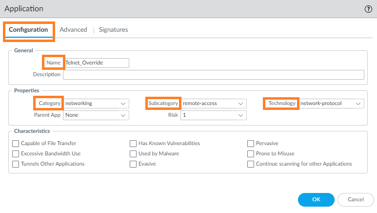 - Name the application (in this case, something other than Telnet, which is already used). The example uses Telnet_Override as the name. Also, select values for Category, Subcategory, and Technology.