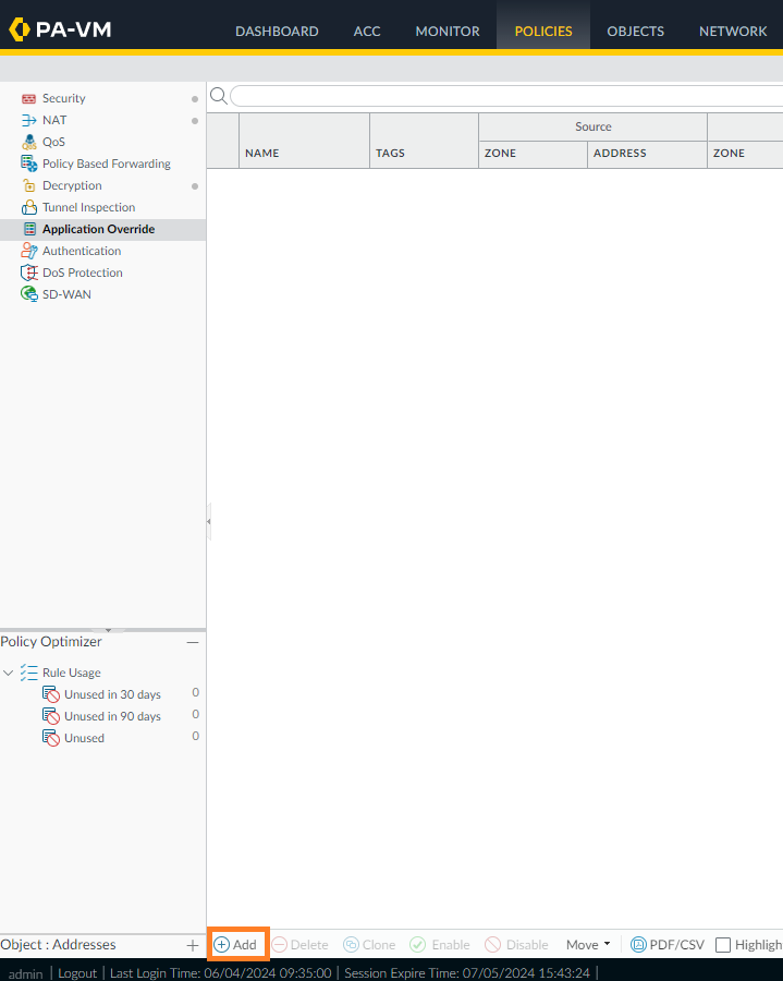 After selecting Port as the parameter, click Add and insert protocol and port, as required. In this example, we don't need a signature, so go ahead and click OK to complete this custom application. - To create an Application Override policy, go to Policies > Application Override, then click Add: