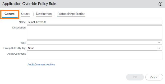 - Under the General tab, enter a name for the policy. The example uses Telnet_Override.